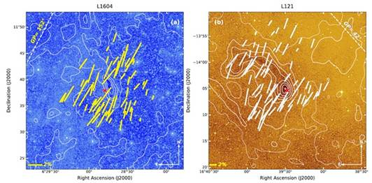The two molecular clouds examined in the study turned out to have very different characteristics. L1604, located toward the Galactic anticentre, lies at a distance of around 816 parsecs and is denser and more massive, with enough material to potentially form many new stars. L121, located toward the Galactic centre, is much closer at about 124 parsecs—nearly seven times closer than L1604—but is less dense and less massive. What makes L121 especially interesting is that it appears to possess a stronger and more orderly magnetic field, suggesting it has not yet been strongly distorted by the violent gravitational collapse seen in more active star-forming regions.