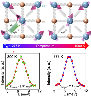 Fig: (Upper Panel) Evolution of dynamic spin-phonon coupling with temperature and its influence on acoustic phonon lifetime. (A) Schematic of coupled spin and phononfluctuations near TN in paramagnetic CrN. At higher temperatures (T >> TN), spin fluctuations and spin-phononcoupling strength diminish. (Lower Panel) Temperature-dependent inelastic X-ray scattering spectrum at q = (0 0 0.18) of CrN highlighting the transverse acoustic (TA) phonon mode. Voigt function–fitted TA phonon mode of CrN at 300K and 373K are presented.Cutting-Edge Experimental Techniques