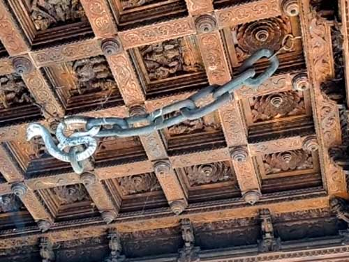Single-stone snake sculpture bound with an iron chain above the Vishnu shrine’s sopana mandapam